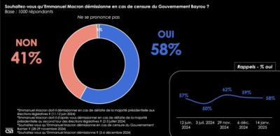 “பெய்ரூவின் அரசாங்கம் கவிழ்க்கப்பட்டால், ஜனாதிபதி மக்ரோன் பதவி விலக வேண்டுமா?” எனும் கேள்வி இந்த கருத்துக்கணிப்பில் கேட்கப்பட்டது. அதற்கு 58% சதவீதமானவர்கள் ‘ஆம்’ (oui) என பதிலளித்துள்ளனர். 41% சதவீதமானவர்கள் ‘இல்லை’ (non) என பதிலளித்துள்ளனர். மீதமான 1% சதவீதமானவர்கள் கருத்துக்கள் தெரிவிக்கவில்லை.