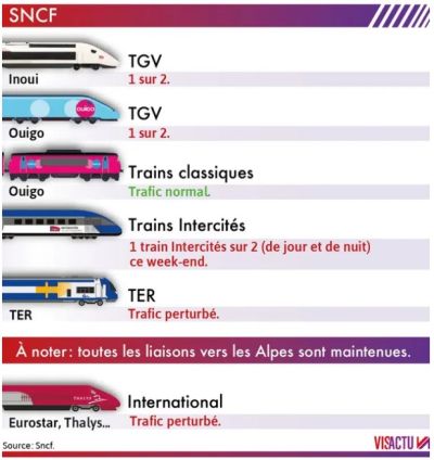 தொடருந்து சேவைகளின் கட்டுப்பாட்டாளர்கள் (contrôleurs) பணி புறக்கணிப்பில் ஈடுபடுவதை அடுத்து, இந்த சேவைகள் பாதிக்கப்பட உள்ளன. குறிப்பாக TGV Inoui, TGV Ouigo சேவைகள் இரண்டில் ஒன்று மட்டுமே இயக்கப்படும்.