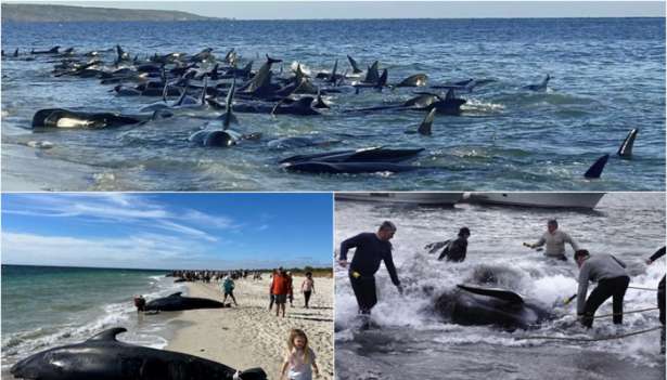 பெர்த்திற்கு தெற்கே சுமார் மூன்று மணி நேர பயணத்தில் புவியியல் விரிகுடாவில் உள்ள டோபி இன்லெட்டில் 160 திமிங்கலங்கள் ஆழமற்ற நீரில் சிக்கிக்கொண்டன.