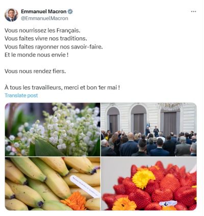 சர்வதேச உழைப்பாளர் தினத்துக்கு ஜனாதிபதி இம்மானுவல் மக்ரோன் வாழ்த்துக்கள் தெரிவித்தார். அவர் தனது X சமூகவலைத்தள பதிவில் ’நீங்கள் பிரான்சுக்கு உணவளிக்கின்றீர்கள். நீங்கள் எங்கள் மரபுகளுக்கு மதிப்பளிக்கின்றீர்கள். எங்களை பெருமை கொள்ளச் செய்கின்றீர்கள்!” என பதிவிட்டார்.