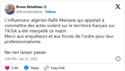 அதில் ஒரு பகுதியாக TikTok சமூகவலைத்தளத்தில் பிரபலமாக இருக்கும் அல்ஜீரியாவைச் சேர்ந்த Rafik Meziane, இன்று ஜனவரி 22 ஆம் திகதி கைது செய்யப்பட்டதாக உள்துறை அமைச்சர் Bruno Retailleau அறிவித்துள்ளார். 300,000 பேர் பின் தொடரும் TikTok கணக்கு வைத்திருக்கும் அவர், “பிரெஞ்சு பிரதேசத்தில் வன்முறைச் செயல்கள் செய்யப்பட வேண்டும்" என காணொளி ஒன்றில் குறிப்பிட்டுள்ளார். அதை அடுத்தே அவர் கைது செய்யப்பட்டார்.